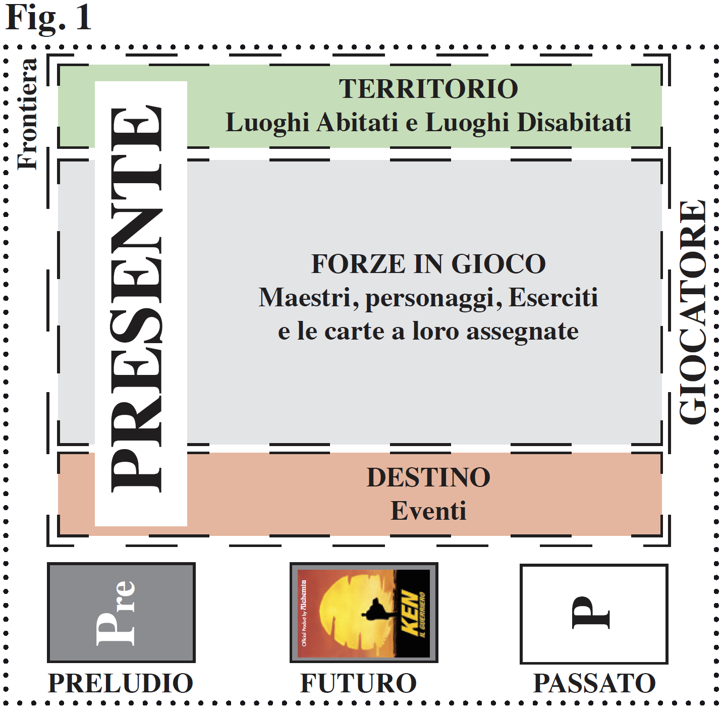 TERRITORIO è l’area di gioco che contiene i Luoghi e le carte a loro assegnate, vengono messi in fila, in ordine determinato dalla sequenza di giocata: il primo Luogo più in basso (più vicino al giocatore) e così via, con l’ultimo più in alto (più vicino all’avversario). Il Luogo più in alto è la Frontiera.