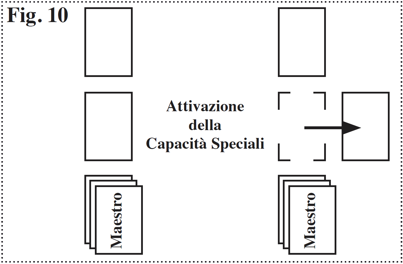 Il combattimento è influenzato dalle Capacità Speciali, queste possono essere da Attivare o Sempre Attive. Quelle da Attivare sono riconoscibili per i Simboli di Scuola o i Simboli di Vita che precedono la descrizione delle capacità e il cui numero di simboli indica la quantità di Vite di un Maestro Comandante o di un Personaggio con Vita nel gruppo necessarie per l’attivazione. Per ciascun gruppo il giocatore può Attivare a sua scelta tutte le capacità Sempre Attive e le capacità che abbiano vicino tanti Simboli di Scuola o di Vita generica quante sono le Vite del Maestro che comanda il gruppo o dei Personaggi nel gruppo, facendo attenzione al numero di Vite necessario per la loro Attivazione. Anche se si hanno a disposizione un numero elevato di Vite Maestro o Personaggio, è possibile attivare la Capacità Speciale di una carta una sola volta per combattimento. Una volta deciso quale Capacità Speciale vada attivata non è più possibile cambiare idea. Le Capacità Speciali di una carta influenzano il combattimento dell suo gruppo se non è specificato altrimenti. Le carte le cui Capacità Speciale sono attivate devono essere evidenziate nel piano di gioco [ Fig. 10 ].