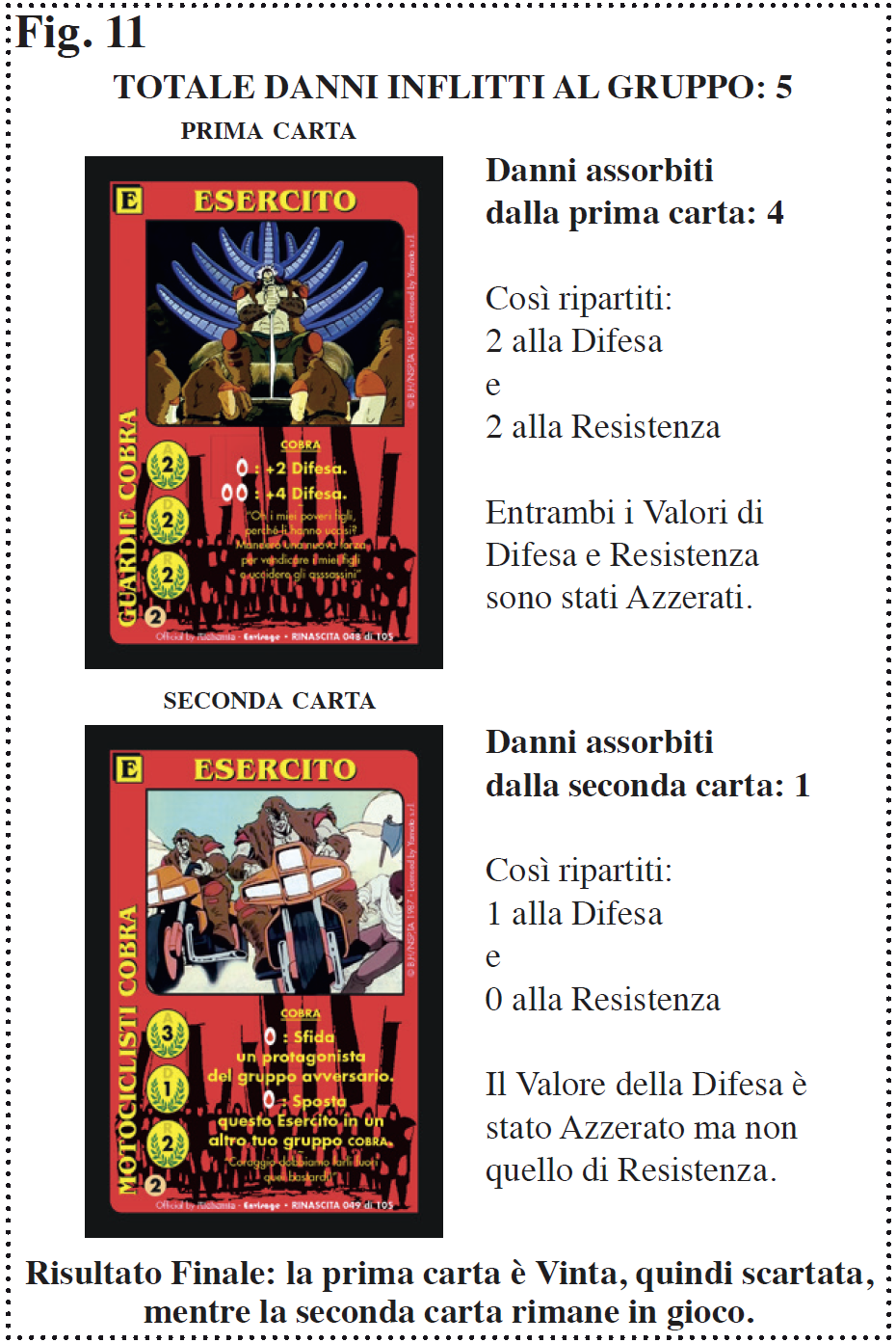 La somma dei Valori di Attacco delle carte che compongono un gruppo (Eserciti e Personaggi con le carte loro assegnate ed eventuali Capacità Speciali attive o il solo Maestro comprese le carte di cui farà uso) rappresenta i danni che il gruppo dell’avversario subirà nel combattimento. I danni sono inflitti contemporaneamente da entrambi i gruppi (attacco e difesa). Per calcolare i danni si inizia dalla prima carta dell’avversario, cioè quella che sta più in alto poi si passa alla successiva e così via finche i danni sono terminati o le carte avversarie sono state tutte Vinte. Quando si infliggono i danni ad una carta prima va sottratta la sua Difesa e poi la sua Resistenza, solo se la Resistenza è completamente Azzerata la carta è Vinta. I danni rimanenti sono quindi inflitti sulla carta successiva con lo stesso metodo [ Fig. 11 ]. Se la Resistenza di una carta non è completamente Azzerata la carta rimane in gioco come se non fosse successo nulla. Una carta che subisce un numero di danni almeno uguale alla sua Resistenza viene Vinta e riposta nel Passato.