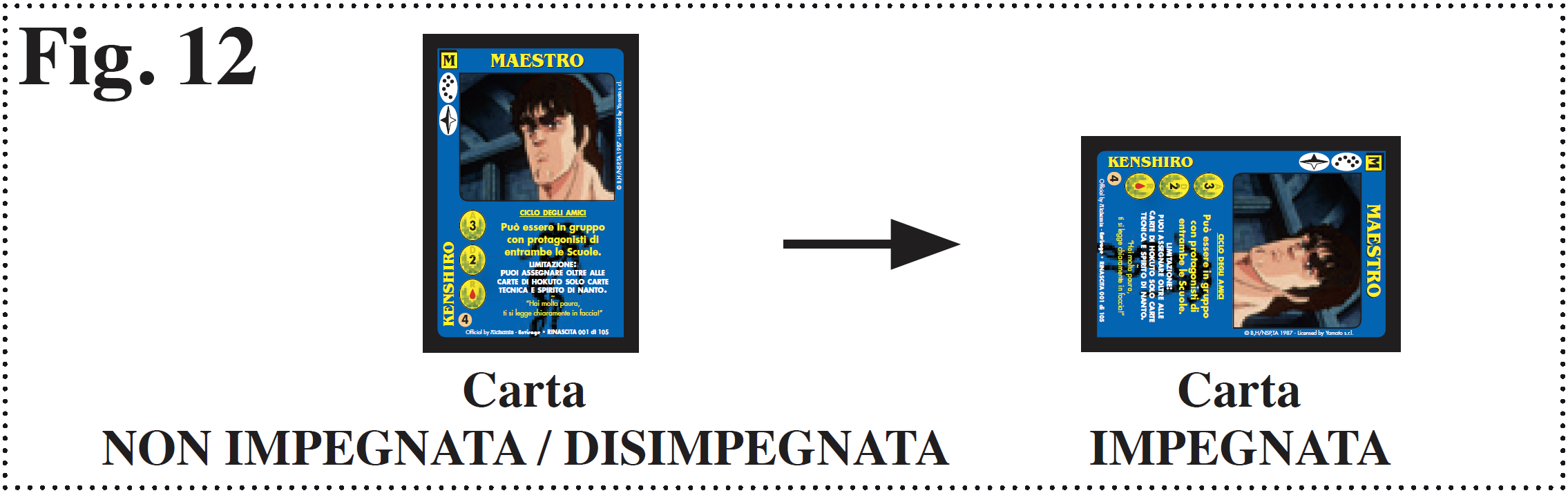 Tutte le carte che hanno fatto parte di un gruppo di attacco o di difesa diventano Impegnate (vanno ruotate di 90° per indicare che non possono essere usate fino alla prossima Fase di Disimpegno del loro possessore) [ Fig. 12 ].