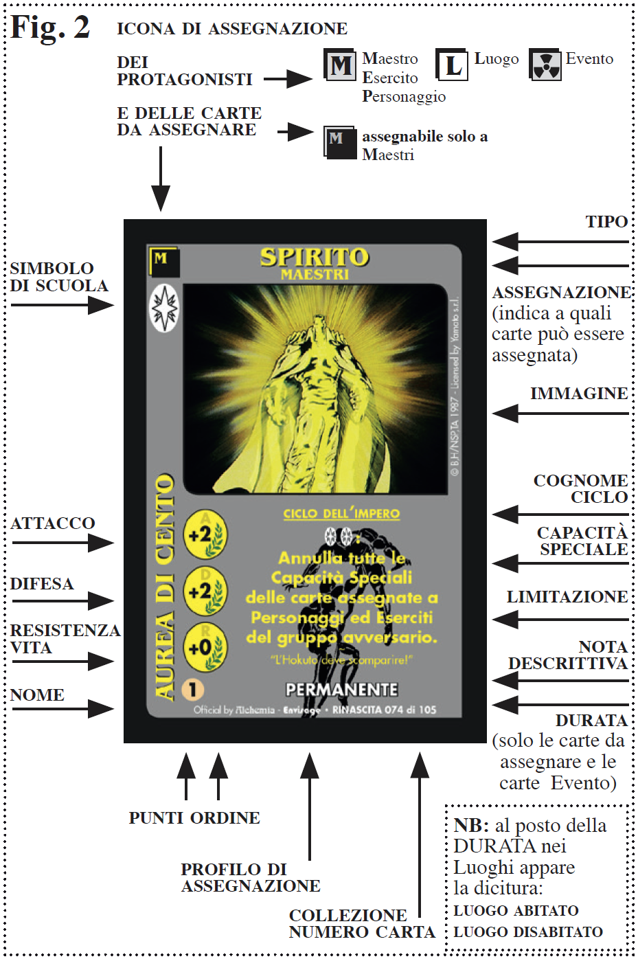 - Tipo: designa la categoria a cui appartiene la carta e, quindi, definisce come verrà usata. Sotto il Tipo nelle carte assegnabili (Tecnica, Spirito, Equipaggiamento e Speciale) è indicato a quale Tipo di Protagonista (Maestro, Personaggio, Esercito) o Luogo possono essere assegnate.