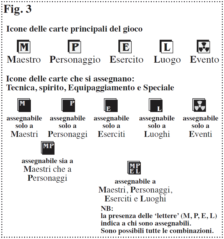 Tutte le carte hanno una propria Icona di Assegnazione. Lo scopo di questa Icona è di identificare rapidamente il Tipo di carta e nel caso di quelle Assegnabili (Tecnica, Sprito, Equipaggiamento, Speciale e Critico) a quale Tipi di carte possono essere assegnate [ Fig. 3 ].
