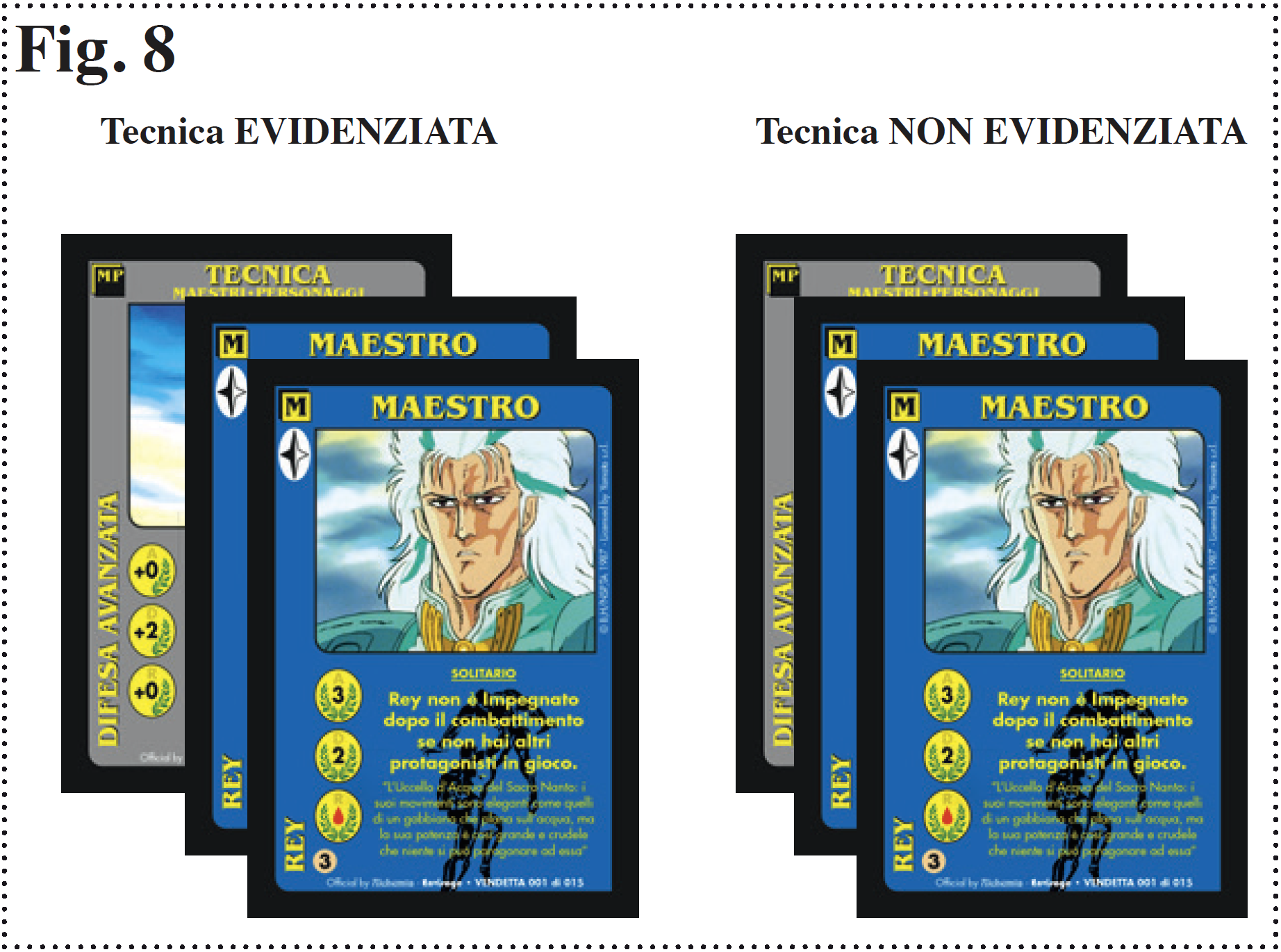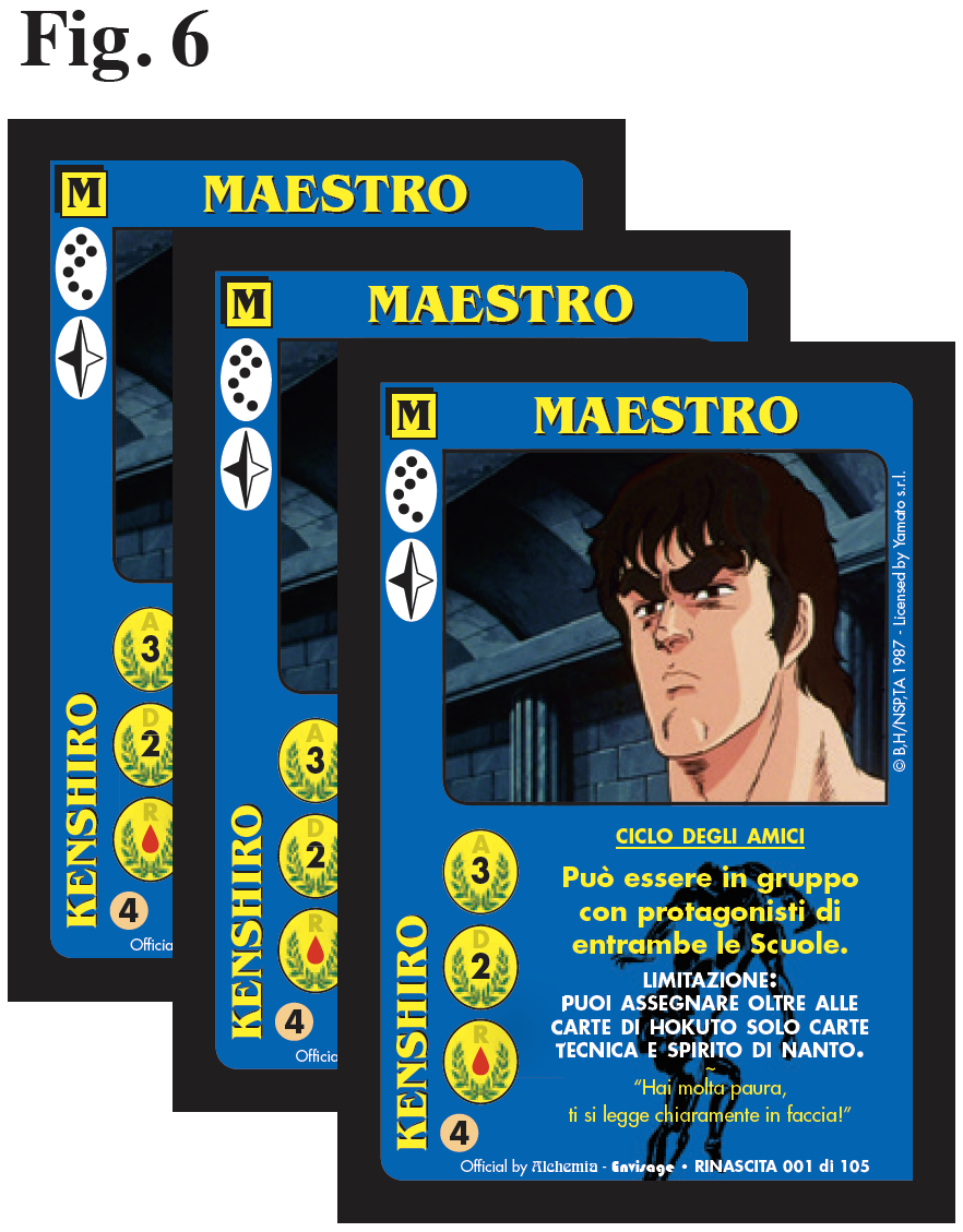 La Vita indica inoltre anche l’Unicità di un protagonista: un giocatore quando si trova contemporaneamente in gioco, nell’area delle Forze in Gioco, e in mano, una carta Maestro, etc, con Vita e vuole giocare la carta che ha in mano la deve porre sopra a quella che ha già in gioco ottenendo il risultato di aumentarne l’Esperienza, non si somma nessun Valore o Capacità Speciale ma si ottiene solamente che ha più Vite [ Fig. 6 ]. |
