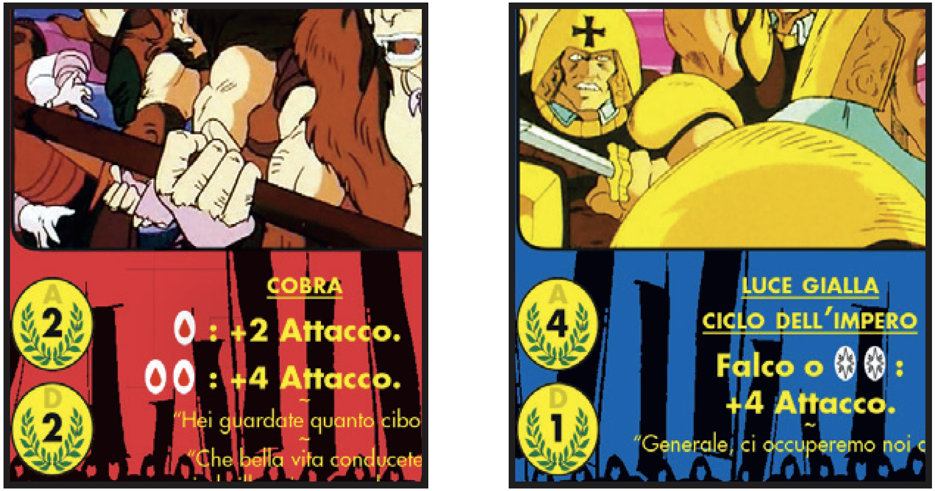 - Valori: sono Attacco, Difesa e Resistenza (sono tre valori numerici, unica eventuale eccezione può essere la Resistenza nella quale può comparire il simbolo di Vita, rappresentato da un simbolo che ricorda una Goccia di Sangue).