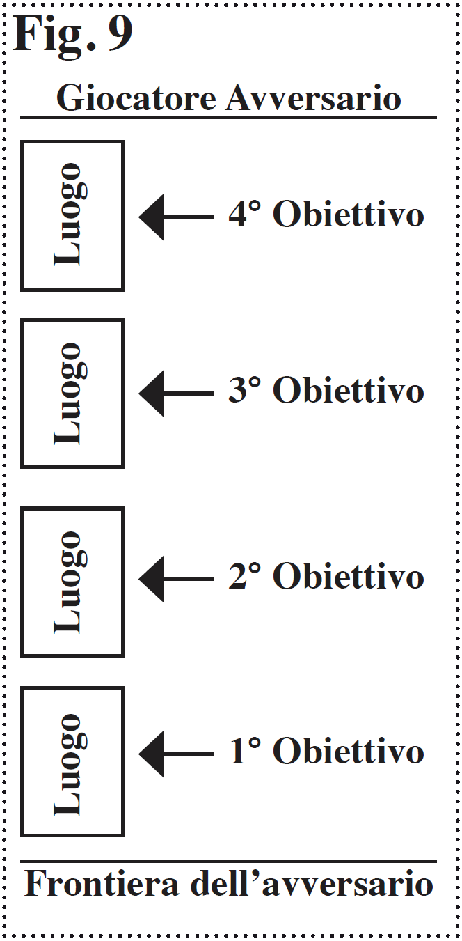 Se il Giocatore di Turno decide di attaccare l’avversario, con uno o più propri Protagonisti, deve seguire uno schema. Il Giocatore di Turno forma dei gruppi di carte, come leggerai nel punto successivo “i gruppi”, e designa ad alta voce l’obiettivo di ciascun gruppo che attacca. Esiste un ordine preciso nella dichiarazione: il primo gruppo deve attaccare la carta Luogo giocata per ultima dall’avversario, quella più vicina alla Frontiera, poi può attaccare in sequenza anche gli altri Luoghi con altri gruppi, dal più vicino alla Frontiera fino a quello più lontano [ Fig. 9 ]. Non esiste limite al numero di Luoghi che possono essere attaccati, a patto che ogni luogo sia attaccato da almeno una carta Esercito, o Personaggio o Maestro. Solo se l’avversario non ha Luoghi nel proprio Presente, le sue carte Maestro, Personaggio ed Esercito possono essere attaccate singolarmente, precludendo in questo caso all’avversario la possibilità di formare dei gruppi di difesa come accade per i Luoghi. Il giocatore di Turno forma i gruppi di attacco ed indica quali carte sta attaccando (anche se quest’ultime sono Impegnate), il difensore non può formare gruppi di difesa e le sue carte protagonista devono difendersi da sole. Questo rende molto vulnerabile in difesa chi non possiede Luoghi. |